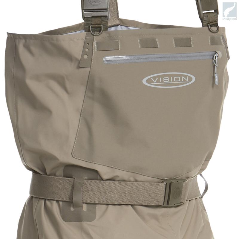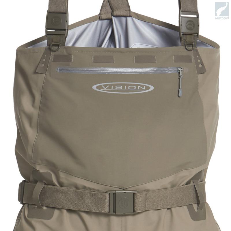 Vision Koski waders are made from soft and comfortable materials. The lower part’s thicker material comes up to your thighs, so it makes this wader strong. The water resistant front pocket is made from wader fabric and features water resistant YKK AquaGuard zipper. There are an accessory attachment loops on both sides of the pocket and accessory strap on the upper end of the pocket, both outside and in so you can attach lots of useful tools to this wader. This wader comes with a waterproof, clear TPU pocket which is removable and ideal for your phone and car keys. There is a strong velcro for easy and quick attachment and two securing strings with hooks to secure this pocket.