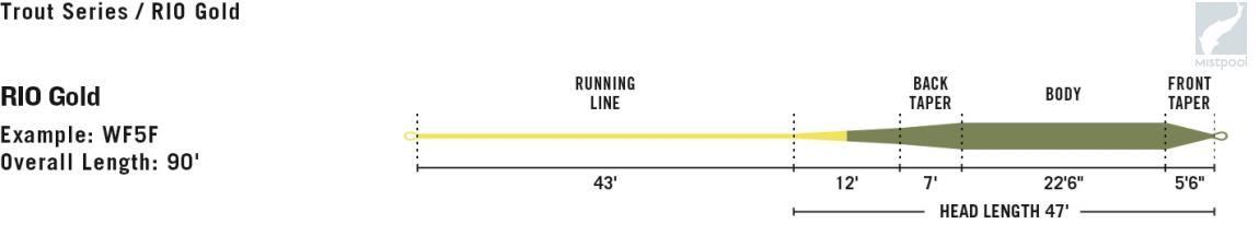 RIO Premier Gold - updated version of the popular RIO Gold fly line! The RIO Gold has been the go-to trout line around the world for many years, and for a multitude of fly fishers. The line has a long head and back taper that give casters total line control and stability at range - whether casting or mending. The unique profile is designed to load a fly rod at close range, and has a front taper that delivers perfect presentation of flies between sizes #22 and #2.