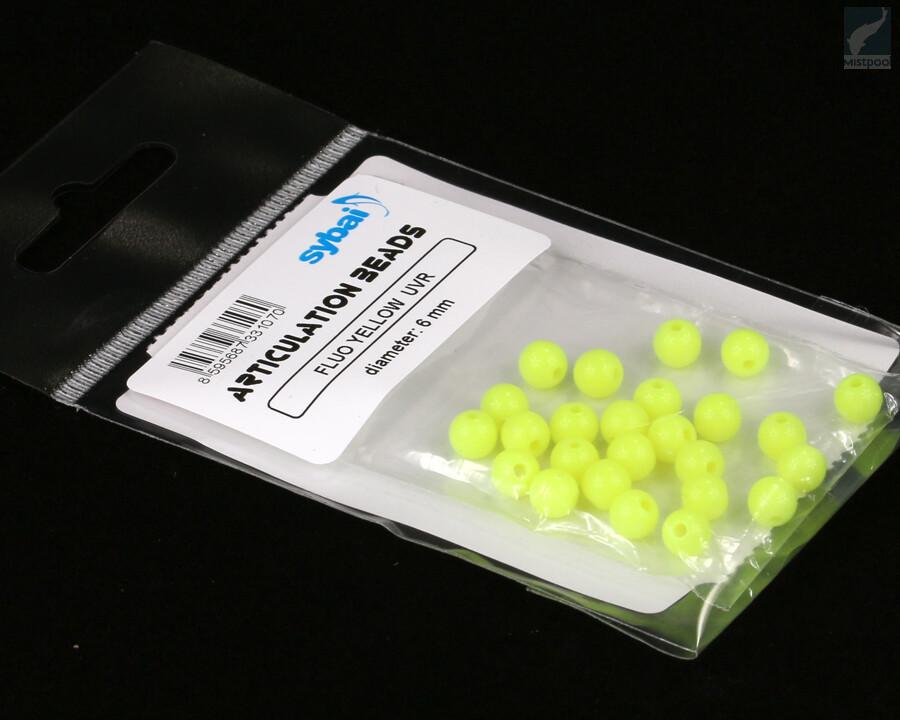 Sybai Articulation Beads are designed for fly tying and have a large size with a 6 mm outer diameter. They can be used for building pike fly rigs (e.g. Bauer Pike Rig) or as a strike point similar to regular bead heads. The beads are made of plastic and keep the fly light.