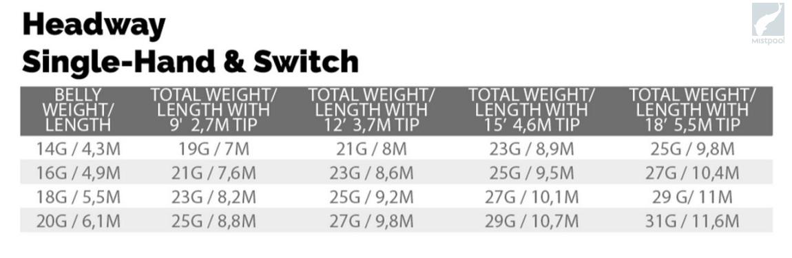 The 14g, 16g, 18g & 20g bellies can all be combined with the Headway tips in 9’, 12’, 15’ & 18’. This means there are belly/ tip combinations starting from 6wt single hand rods, through Switch rods and up to 7/8 wt and 8/9 wt double hand rods, making this system the first of its kind in the fly fishing industry.