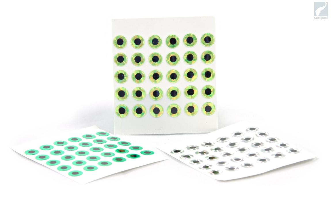 Adhesive Tape Eyes are thin and more flexible than most other eyes. They will reflect light well and give realistic look for your flies. Coat with UV glue for the best look and durability.