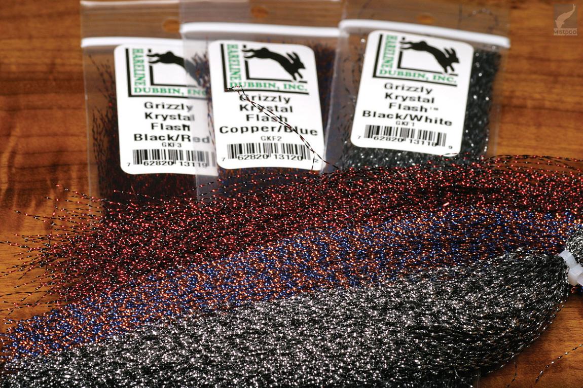 Grizzly Krystal Flash on tavallisen Krystal Flashin tapaista kimalletta. Grizzly Krystal Flashissa on kierrettynä kahta eri väriä, mikä luo luonnollisen vaihtelevan värin kuidulle. Soveltuu antamaan kimalletta moniin eri perhomalleihin. Kokeile esimerkiksi putkiperhojen siivissä ja katkaperhojen pyrstöissä.