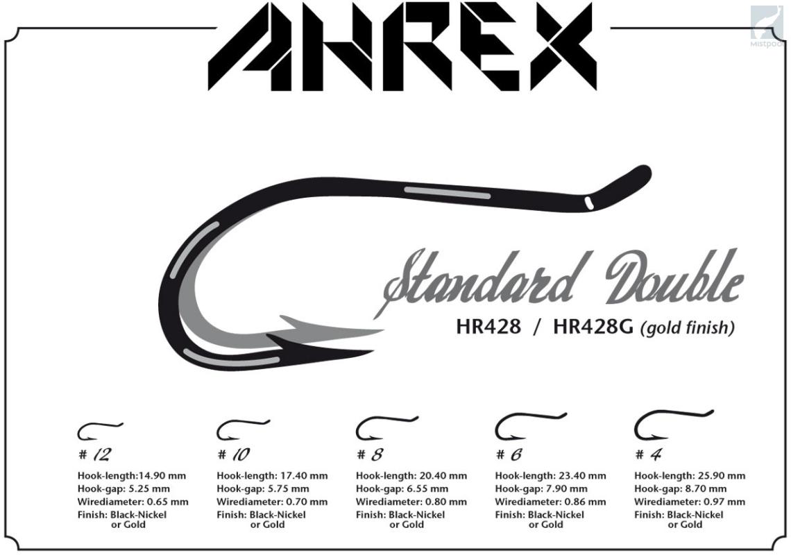 Ahrex HR428 - Standard Double on perinteisesti muotoiltu melko lyhytvartinen kaksihaarakoukku lohi- ja meritaimenperhojen sidontaan. Katso myös saman koukun kullanvärinen malli Ahrex HR428G ja hopeanvärinen malli Ahrex HR428S