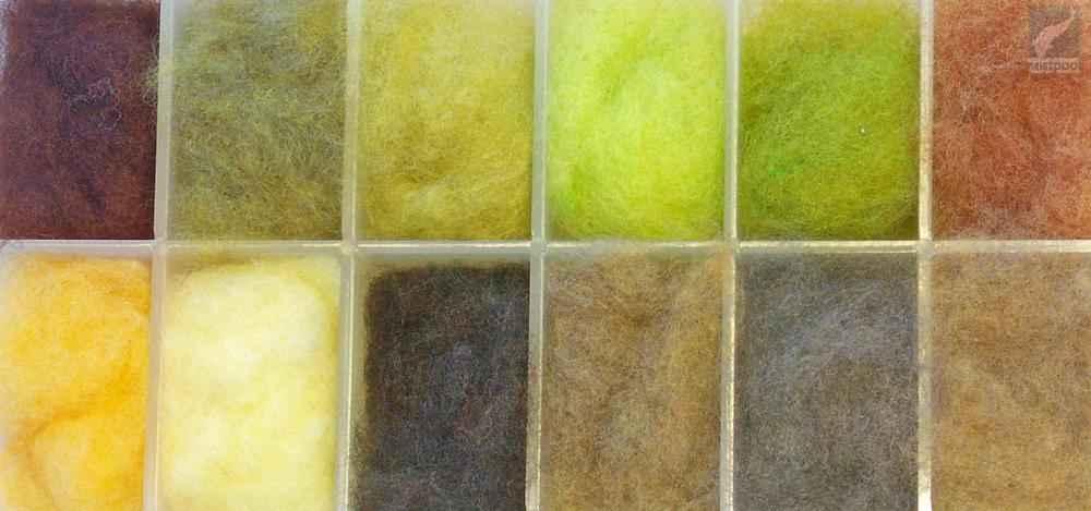 Lajitelmassa on seuraavat 12 väriä: Mahonki Dun, BWO Oliivi (harmaa), PMD Olive Dun, PMD Keltaoliivi, BWO Oliivi, Red Quill, Oranssi (rikki), Keltainen (rikki), Trico, Callibaetis, Baetis Harmaa ja Baetis Tan. Dubbinrasian pohjassa on pienet reiät, joista dubbingia on kätevä ottaa esim. pinseteillä.