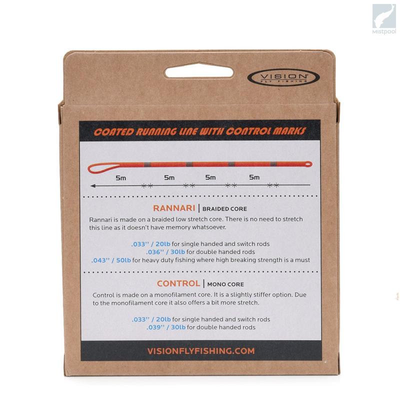 Vision Control Running Line -juoksusiima helpottaa oikean siimapituuden pitämistä heittoa varten mikä helpottaa perhon tarkkaa tarjoamista kalalle. Tässä monofiiliytimellisessä juoksusiimassa on kelluva oranssi HiFlo-pinnoite tummanvihreillä merkinnöillä 5 metrin välein. Tämä auttaa hahmottamaan kuinka pitkälle heitot menevät ja tärpin saadessa ottipaikka on tarkemmin muistissa. Monofiiliytimellinen juoksusiima on hieman jäykempää kuin Vision Rannari -juoksusiima. Monofiiliydin tuo siimaan joustoa väsytystilanteessa. Juoksusiiman toisessa päässä on suuri valmissilmukka ja toisessa päässä pieni silmukka helpottamassa siiman vaihtoa.
