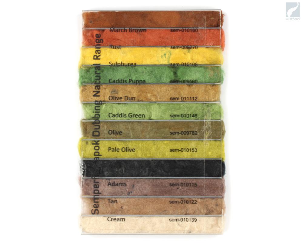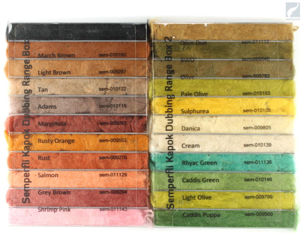 Kapok Dubbing -lajitelma sisältää valikoiman erilaisia värejä. Kapok Dubbing on Semperflin valmistamaa vettä hylkivää, nopeasti kuivuvaa ja hyvin kelluvaa dubbingia. Se painaa vain kahdeksasosan puuvillan painosta. Kapokia on käytetty pelastusliiveissä ja -veneissä ja sen kellutusominaisuudet ovat erinomaiset.