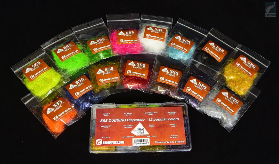 Frödinflies SSS Dubbing -lajitelma sisältää 12 suosittua väriä. SSS Dubbing on putkiperhojen sidontaan suunniteltua dubbingmateriaalia. Synteettisten kuitujen seassa on kimallekuituja, jotka parantavat perhon näkymistä vedessä. Kuidut ovat sopivan pitkiä, jotta niitä voidaan harjata dubbauksen jälkeen auki ilman että runko ohentuu liikaa. Kuidut itsessään ovat hyvin läpikuultavia, mikä on ominaisuus jota Mikael Frödin pitää hyvin tärkeänä lohi- ja meritaimenperhoja sidottaessa.