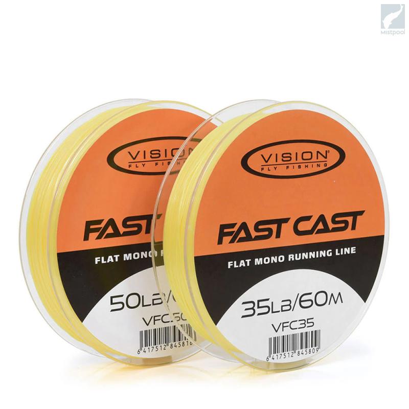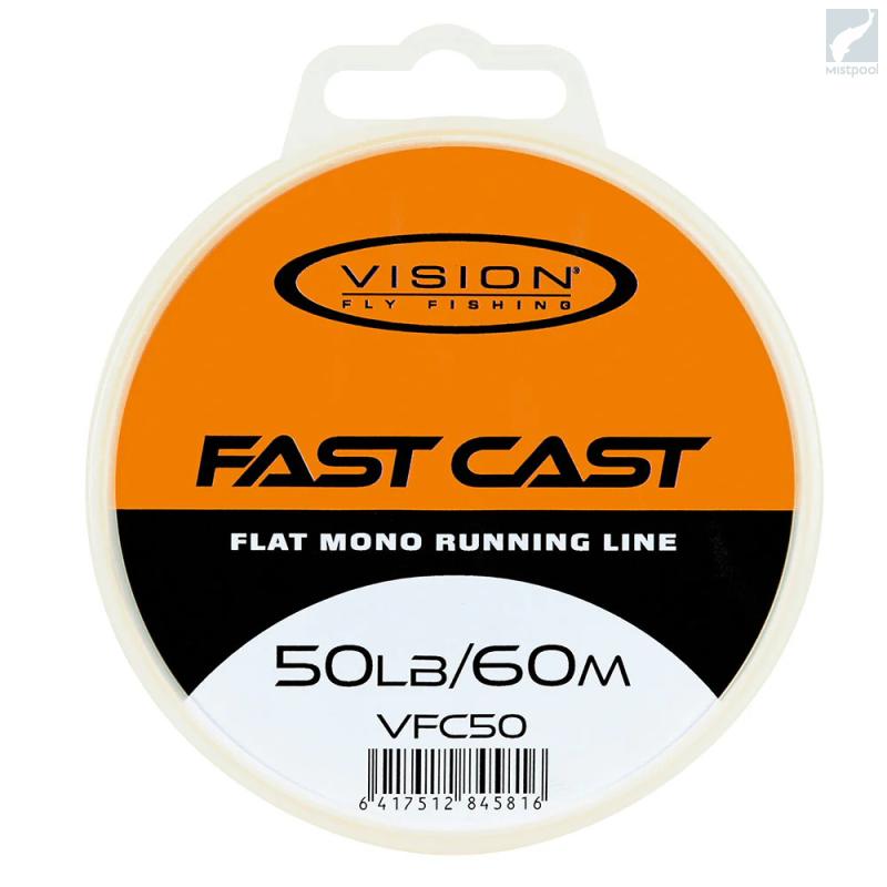 Vision Fast Cast Flat Running Line -juoksusiima on profiililtaan litteä. Tämän ansiosta se kulkee vaparenkaiden läpi pienemmällä kitkalla parantaen heittopituuksia. Hyvä valinta suuremmille joille ja paikkoihin, joissa heitoilta vaaditaan mahdollisimman pitkää etäisyyttä. Siiman tiheys on lähellä vettä, joten sen avulla uppoavat ampumapäät on helpompi upottaa syvälle. Vähäjoustoinen ja -muistinen rakenne parantaa käyttömukavuutta ja uittotuntumaa. Litteä ja ohut monofiili ei vie yhtä paljon tilaa kelalta kuin perinteiset pinnoitetut juoksusiimat.