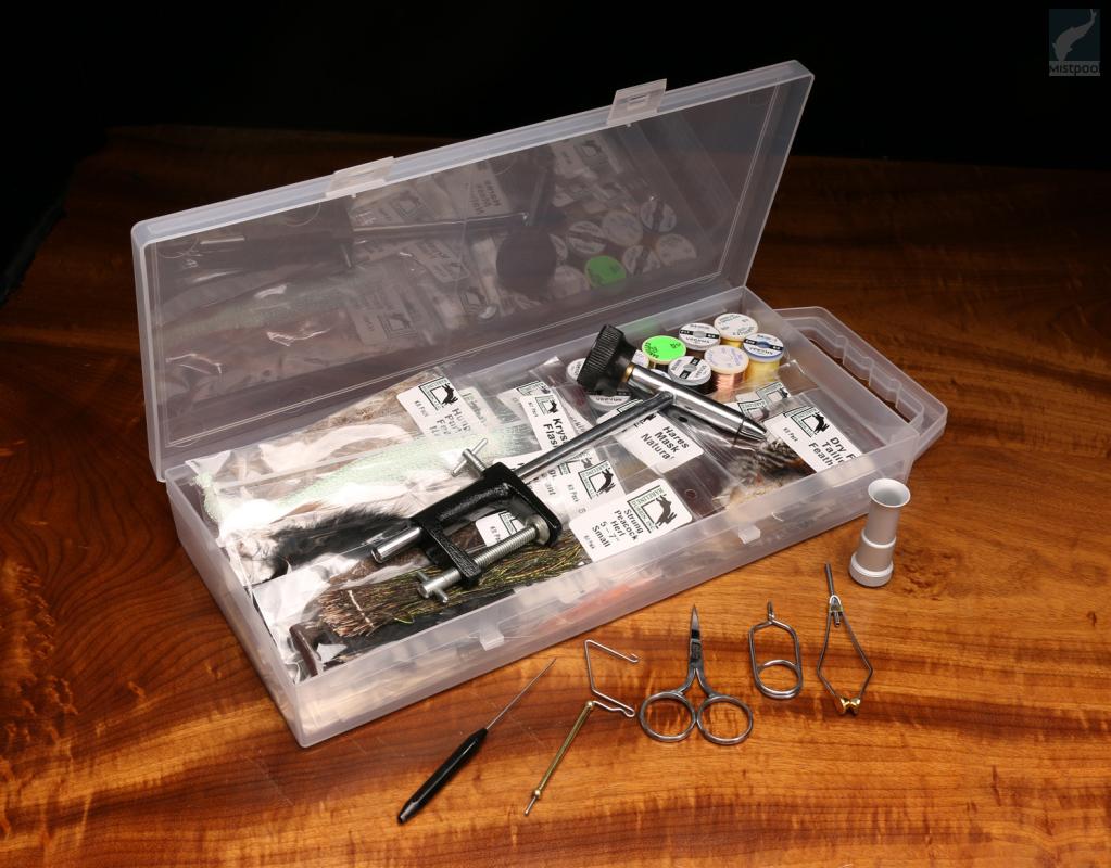 Hareline Fly Tying Material Kit with Economy Tools and Vise includes complete Hareline Fly Tying Material Kit and tools & fly tying vise. Perfect choice for those who want to start fly tying. All materials and tools are packed in transparent plastic box. Includes guide booklet with color pictures (in English) which shows basic techniques and step-by-step introductions for 20 popular fly patterns.