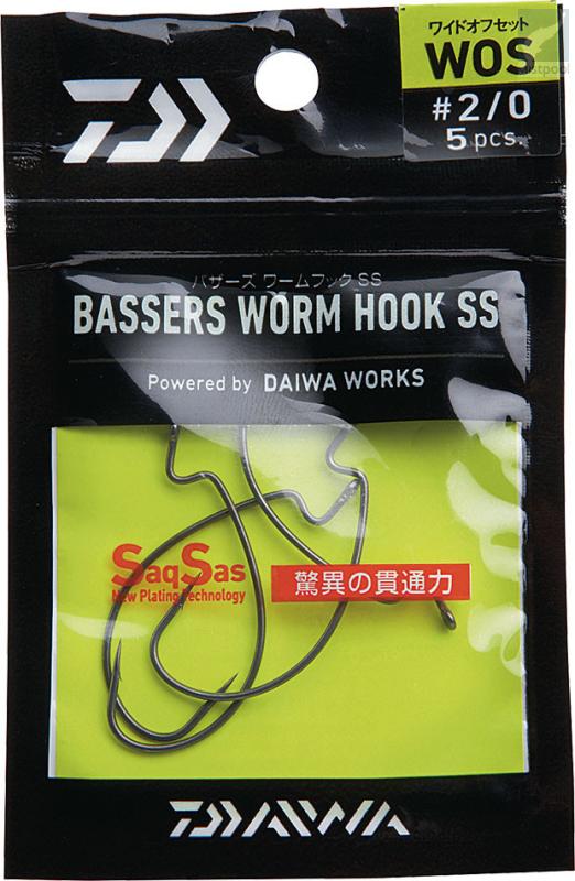 Daiwa SaqSas Bassers Worm Hook WOS - Wide Off-Set jig hooks use Daiwa's coating technology. The fluoride coating reduces the resistance from normal surface irregularities eliminate them almost completely - the result is a hook point that is sharper than compared to traditional production methods. As a result the hook penetrates the fish better than the normal hooks. Several tests of in Japan showed SaqSas hooks point penetration of up to 40% better compared to conventionally sharpened hooks. All SaqSas hooks are made in Japan.