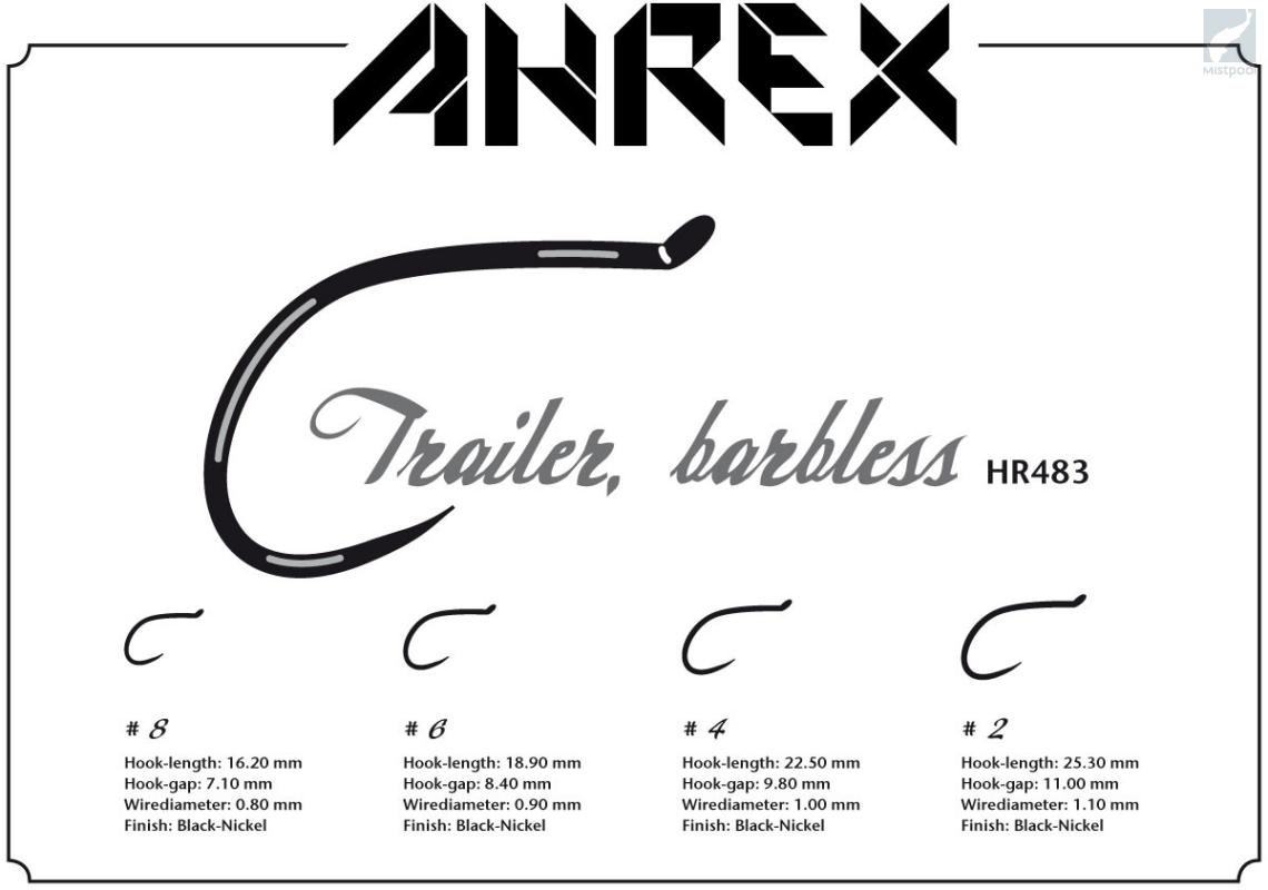 Ahrex HR483 - Trailer Hook Barbless has an aggressive design for optimal hook ups. Trailer hooks – or as they are also called – Stinger hooks are a standard on a vast majority of shanked steelhead flies. This is barbless version so if you are into catch & release this is the hook to use.