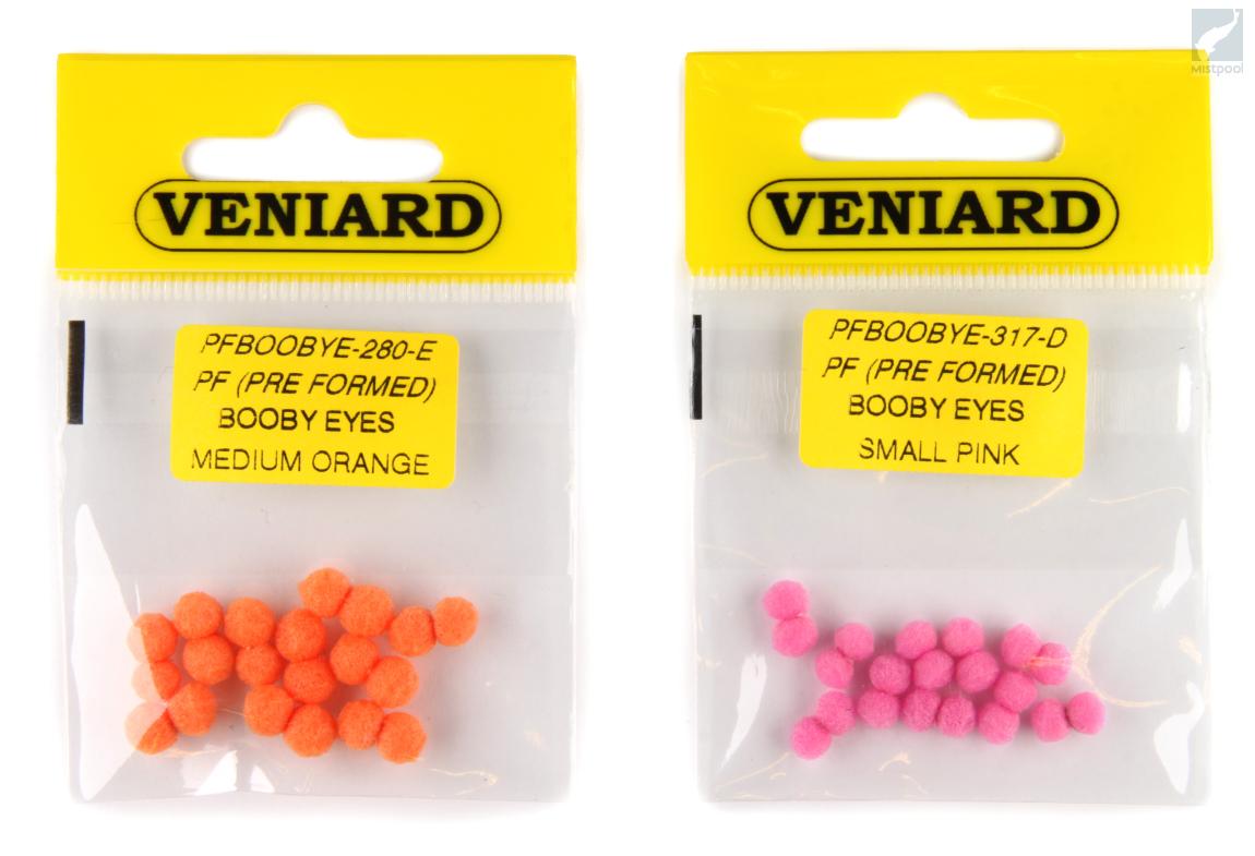 Veniard PFB (Pre Formed Booby) Eyes have been trimmed, shaped and whipped to form perfect booby eyes, ready to be tied in in an instant. These eyes have a bit softer and spongier structure than Floozeyes. 10 pieces per package.