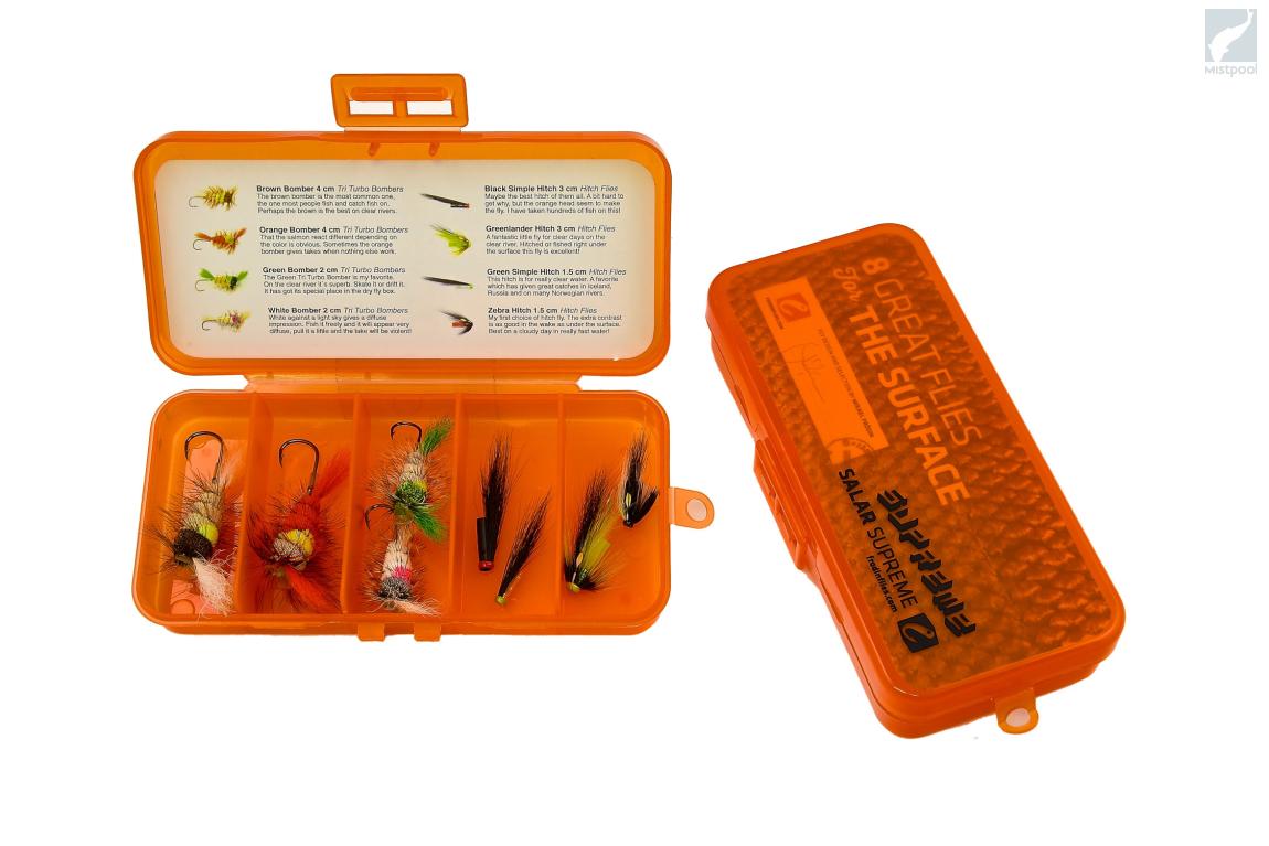Frödinflies 8 Great Flies for The Surface - Dries and skaters that will make your heart stop – flies that give you the best takes. Just do it – dare to fish the surface. Presented in Frödinflies' Hook/Micro Fly SALAR Supreme box.